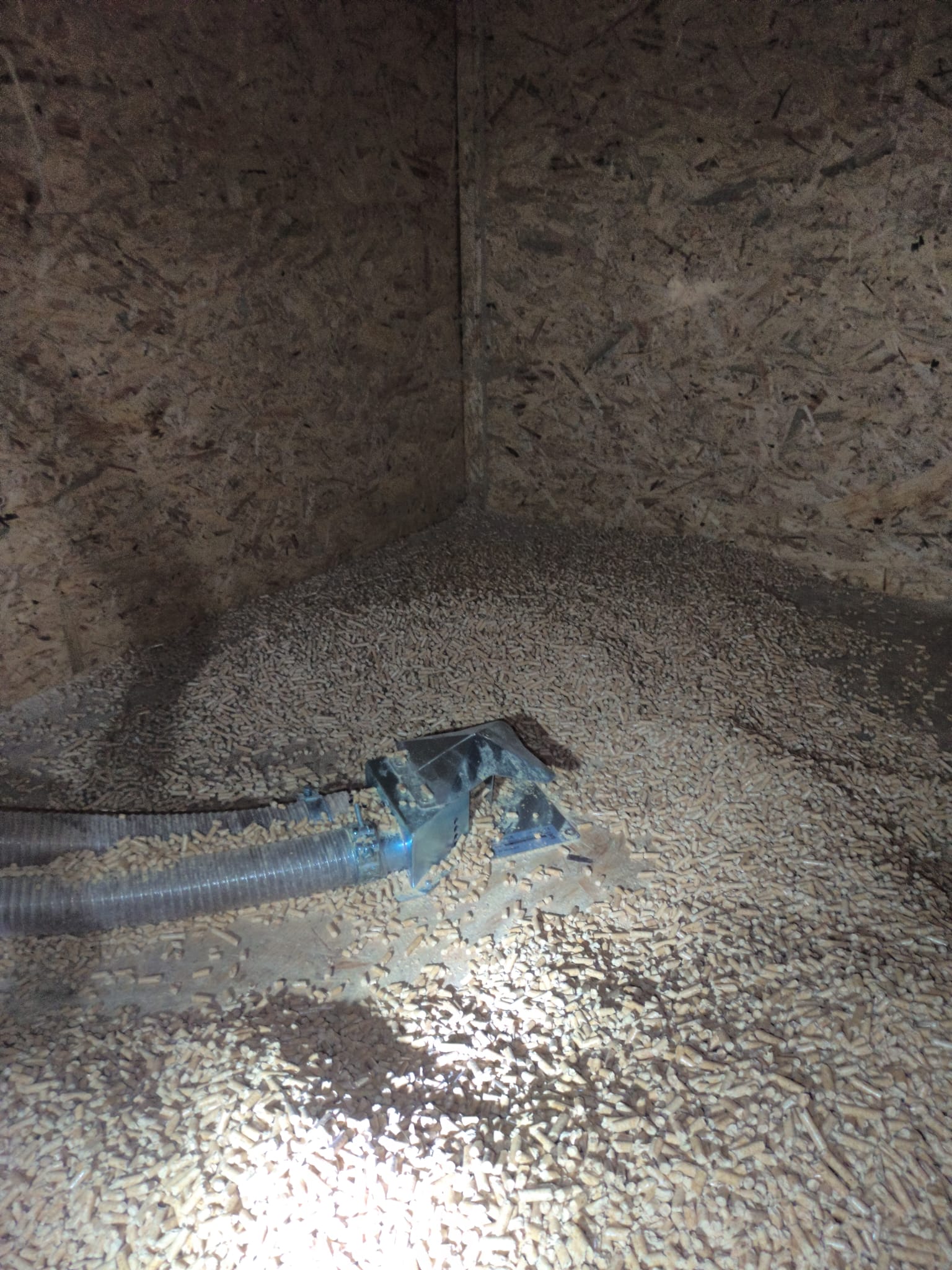Provedli jsme instalaci pneumatické dopravní cesty ze zásobníku paliva do násypky kotle. V zásobníku paliva jsou na dně instalovány dvě nasávací stanice, od nich vede antistatická hadice do přepínače. Pelety se tedy odebírají buď z jedné nebo druhé stanice, nikoli z obou naráz. A následně opět antistatickou hasicí do cyklóny v zásobníku kotle. Cyklóna obsahuje nejen prvek pro odloučení pelet z transportního vzduchu ale i řídící jednotku. Zde se nechá nastavit kdy během dne se mají pelety automaticky doplnit do zásobníku. Zákazník si připravil sklad pelet svépomocí, zhotovil zde rovnou podlahu z důvodu maximálního využití prostoru a možnosti závozu pelet jen jednou ročně, velmi špatná dostupnost k RD v zimě. Řešení skladu s rovnou podlahou má jednu nevýhodu, a to že cca 2/3 se vyberou automaticky a zbylé pelety se musí ručně k stanici přihrnout. Kotel VERNER A602